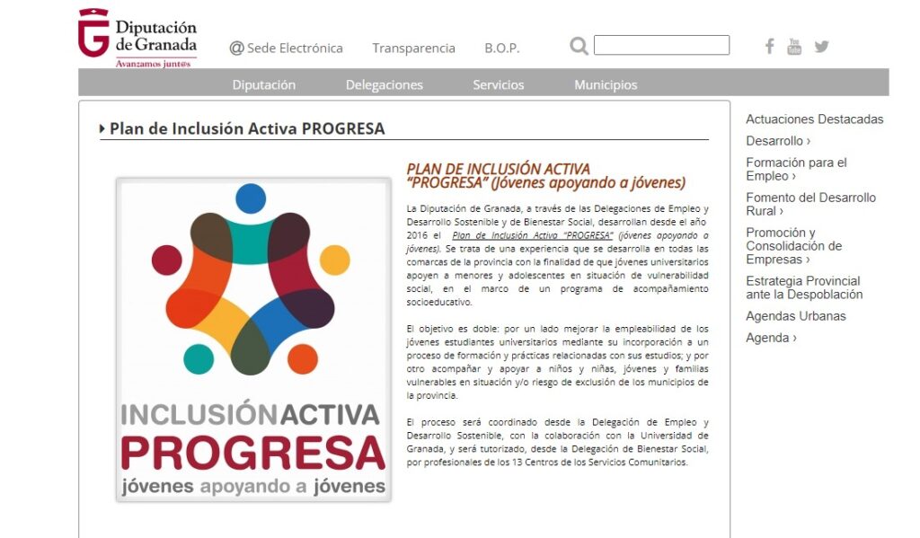 El Plan de Inclusión Activa Progresa (Jóvenes apoyando a jóvenes) es un programa puesto en marcha a través de la Diputación de Granada que consiste en que jóvenes universitarios apoyen a menores y adolescentes en situación de vulnerabilidad social en todas las comarcas de Granada, en el marco de un programa de acompañamiento socioeducativo. El …