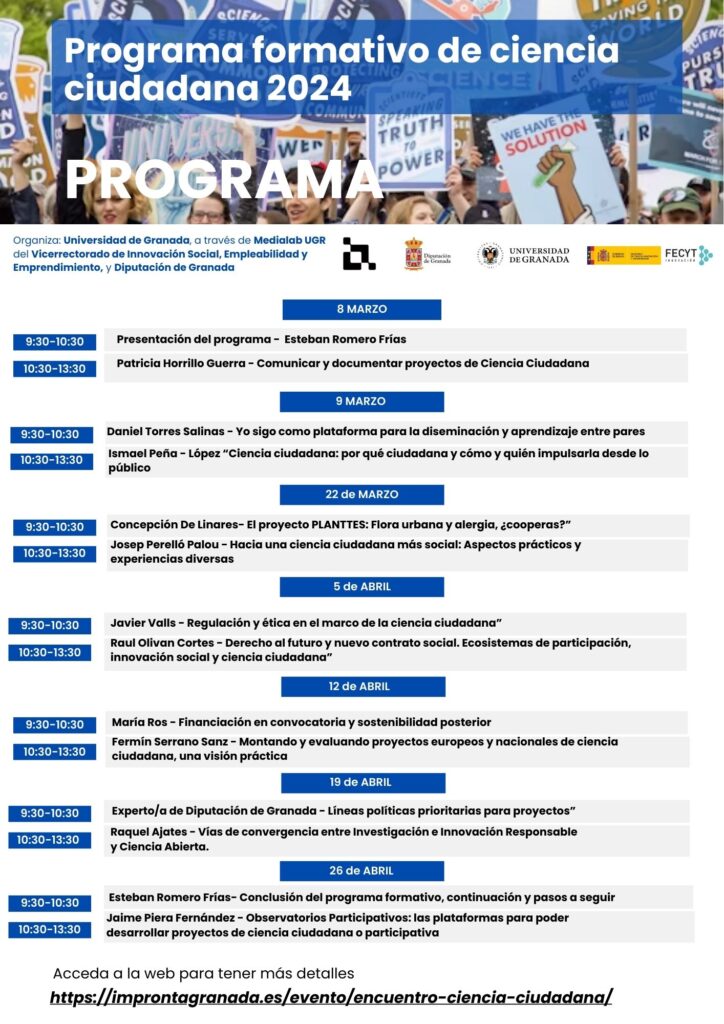 El programa formativo se extenderá durante dos meses, contando con especialistas en diversos ámbitos con una dilatada experiencia en el desarrollo de programas de colaboración y participación en ciencia y en políticas públicas. Se desarrollará, de forma presencial, a lo largo de 7 sesiones, que tendrán lugar los viernes (8, 15, 22 de marzo, y 5, 12, 19 y 26 de abril), de 9:30 a 13:30 en el V Centenario. Para los participantes de Ceuta y Melilla, se facilitará acceso en formato virtual.