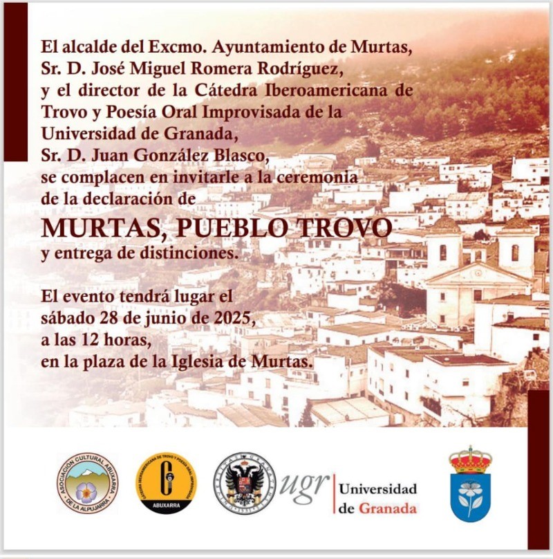 El próximo sábado 28 de junio, el municipio de Murtas se declara “Pueblo Trovo”, un reconocimiento que pone en valor una de las expresiones culturales más singulares del patrimonio inmaterial andaluz: el trovo, arte de la improvisación oral con raíces profundas en la Alpujarra.