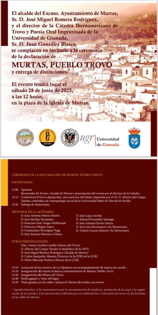 Se celebrará una ceremonia institucional a las 12:00 horas en la Plaza de la Iglesia de Murtas. Además, contará con la presencia del alcalde José Miguel Romera Rodríguez y del director de la Cátedra Iberoamericana de Trovo y Poesía Oral Improvisada de la Universidad de Granada, Juan González Blasco, impulsores de esta iniciativa cultural sin precedentes.