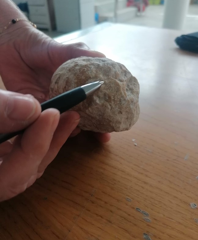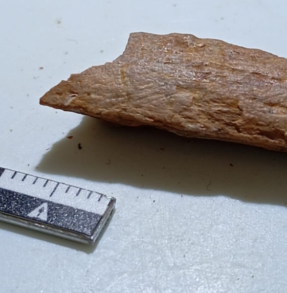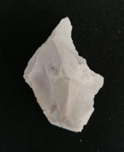 Entre las herramientas fabricadas por los primeros europeos resalta una gran lascas tallada en sílex de alta calidad que presenta un filo trabajado en su parte central. Es lo que en el mundo de la Arqueología se denomina un denticulado, útil tradicionalmente asociado al trabajo de la madera. Junto a él, un gran canto trabajado en cuarzo, materia prima inédita en Orce hasta 2024, con el que sirvió como percutor (martillo para tallar otras rocas) y como utensilio para machacar o triturar, puesto que una parte dejar ver un intenso repiqueteo.