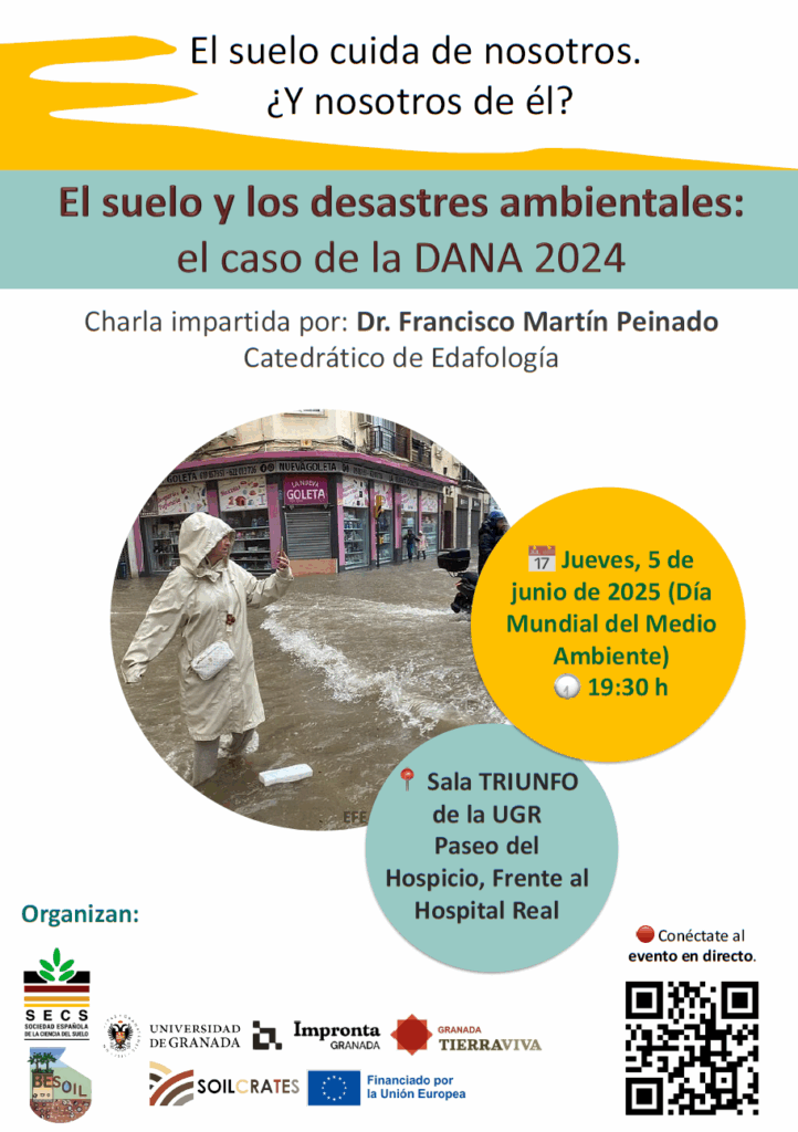 La conferencia, titulada “El suelo y los desastres ambientales: el caso de la DANA 2024”, será impartida por el Dr. Francisco Martín Peinado, Catedrático de Edafología, reconocido experto en el área y miembro del equipo de Granada Tierra Viva.