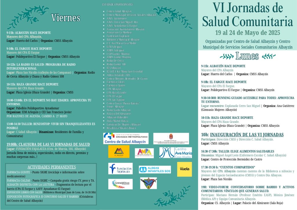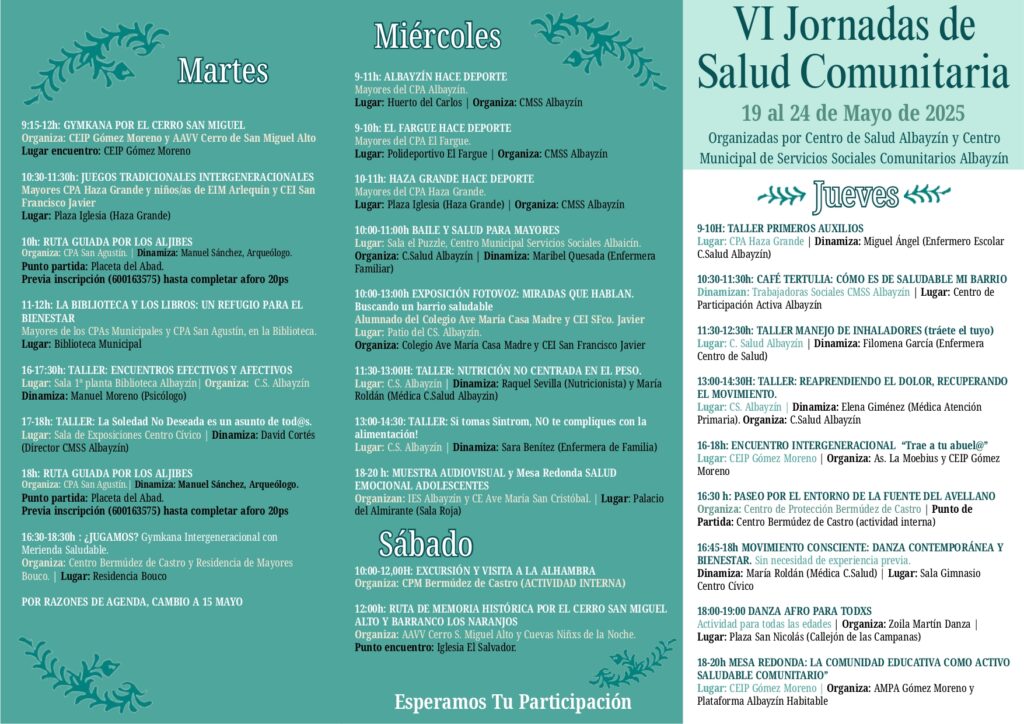 Del 19 al 24 de mayo de 2025, el barrio del Albayzín será el escenario de las VI Jornadas de Salud Comunitaria, un evento organizado por el Centro de Salud Albayzín y el Centro Municipal de Servicios Sociales Comunitarios de Albayzín. Durante una semana, se llevarán a cabo diversas actividades que promueven la salud, la integración social y el bienestar de todos los vecinos de la comunidad.